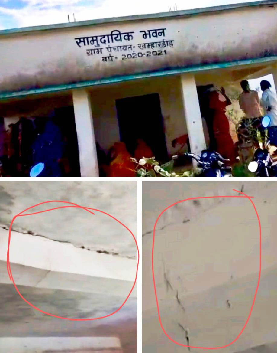 सिंगरौली। जनपद पंचायत चितरंगी क्षेत्र के ग्राम पंचायत खम्हारडीह ग्राम पंचायत में करीब चार साल पूर्व करीब 10 लाख रूपये की लागत से सामुदायिक भवन का निर्माण कार्य क्रियान्वयन एजेंसी ग्राम पंचायत के द्वारा कराया गया था। किंतु गुणवत्ता विहीन कार्य एवं घटिया मटेरियल के चलते भवन के पिलर, बीम एवं दिवाल में जगह-जगह दरारें पड़ रही हैं। साथ ही बारिश के समय छत से अंदर पानी भी टपकता है।
